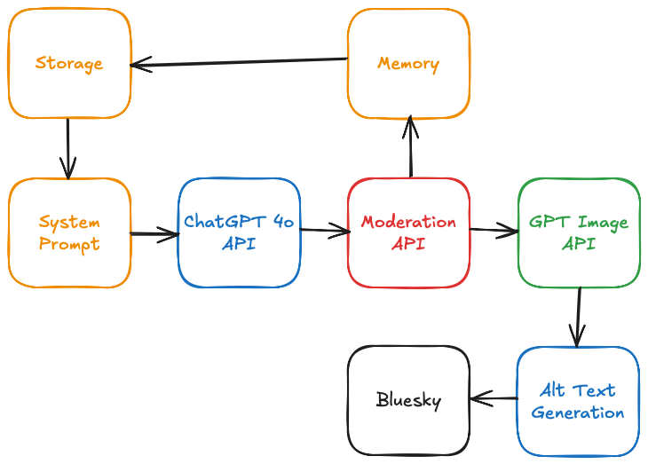 The prompt is sent back into the LLM to construct a memory of today's art for storage and use in future runs. The prompt is then sent to GPT Image to actually produce the art. The returned graphic is sent to the GPT Vision API to produce "alt text" and all of that is bundled together into a post that is submitted to Bluesky.